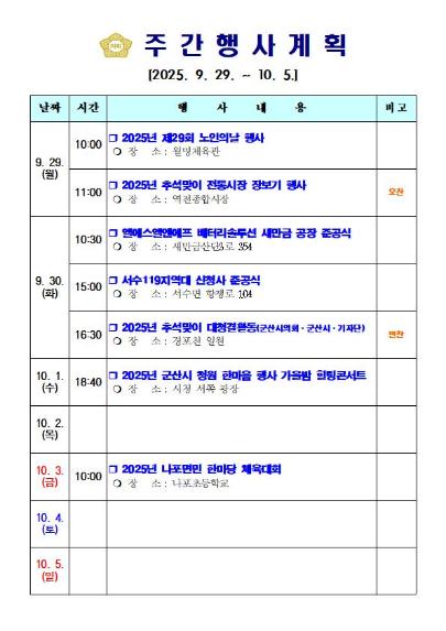 의회 주요업무 및 행사 (9.29~10.5)![]() |