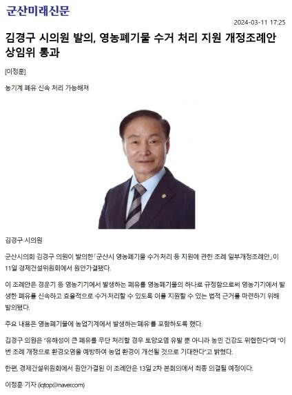 | 김경구 시의원 발의, 영농폐기물 수거 처리 지원 개정조례안 상임위 통과 | |||||