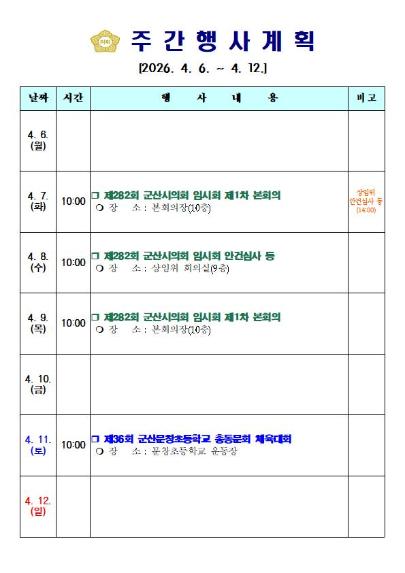 | 군산시의회 주요 행사(4.6.~ 4.12.) | |||||