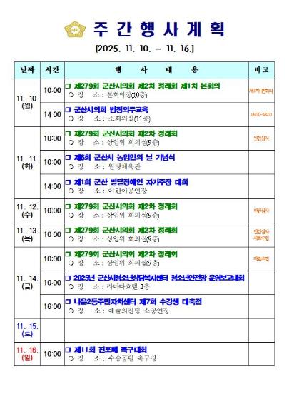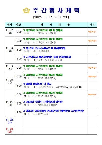 | 의회 주요업무 및 행사 (11.17~11.23) | |||||