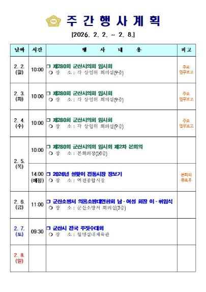 | 이전글 | 의회 주요업무 및 행사(1.26~2.1) |